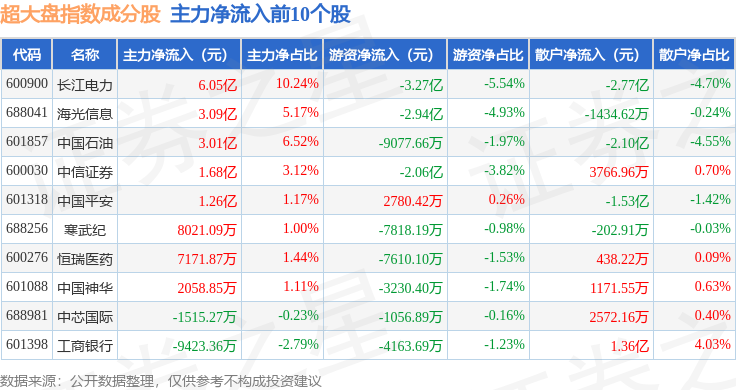 资金流向方面,超大盘(000043)指数成份股当日主力资金净流出合计19.67亿元,游资资金净流出合计4.15亿元,散户资金净流入合计23.81亿元。成份股资金流向详情见下表: