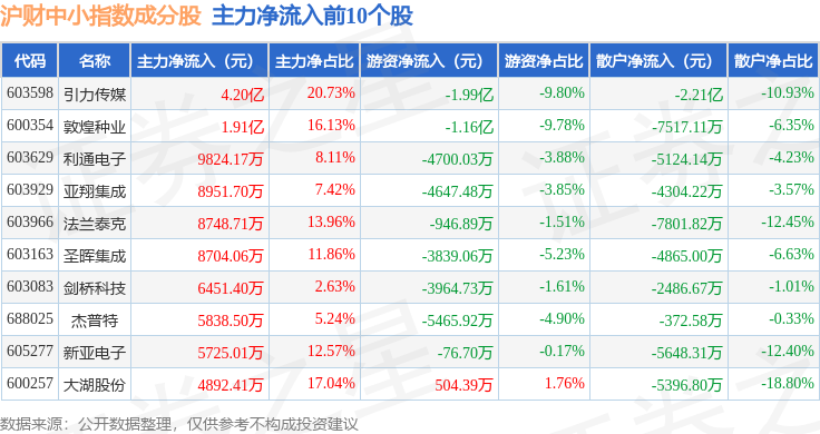 资金流向方面,沪财中小(000091)指数成份股当日主力资金净流出合计15.72亿元,游资资金净流出合计2.07亿元,散户资金净流入合计17.79亿元。成份股资金流向详情见下表: