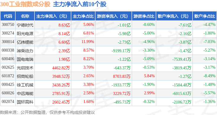 资金流向方面,300工业(000910)指数成份股当日主力资金净流出合计41.33亿元,游资资金净流入合计1.34亿元,散户资金净流入合计39.99亿元。成份股资金流向详情见下表: