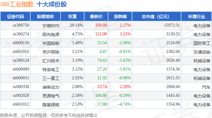 证券之星消息,1月30日,300工业(000910)指数报收于2532.06点,跌0.26%,成交1213.17亿元,换手率1.34%。当日该指数成份股中,上涨的有16家,亿纬锂能以5.07%的涨幅领涨,下跌的有47家,阿特斯以6.08%的跌幅领跌。