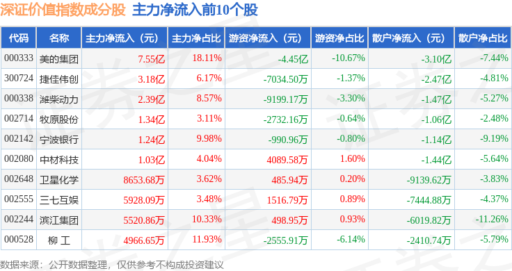 资金流向方面,深证价值(399348)指数成份股当日主力资金净流出合计62.2亿元,游资资金净流入合计21.76亿元,散户资金净流入合计40.44亿元。成份股资金流向详情见下表: