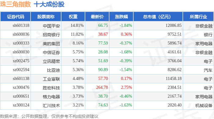 珠三角(399356)指数十大成份股详情如下: