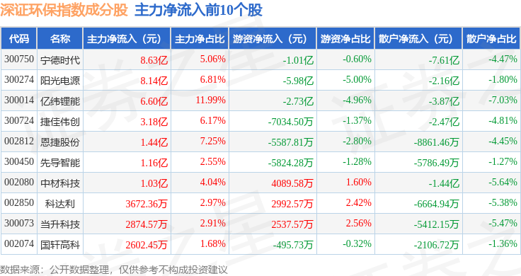资金流向方面,深证环保(399638)指数成份股当日主力资金净流出合计22.93亿元,游资资金净流入合计1.13亿元,散户资金净流入合计21.8亿元。成份股资金流向详情见下表: