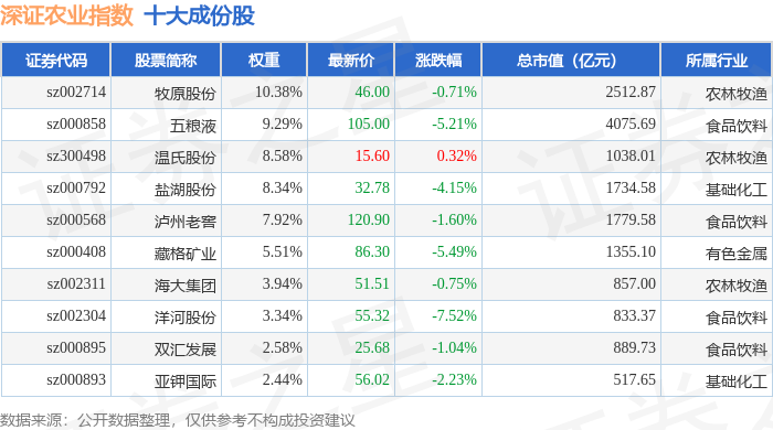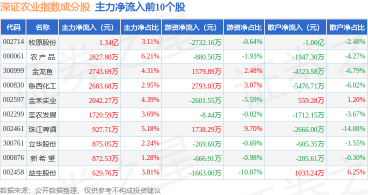 资金流向方面,深证农业(399669)指数成份股当日主力资金净流出合计27.93亿元,游资资金净流入合计7.57亿元,散户资金净流入合计20.36亿元。成份股资金流向详情见下表: