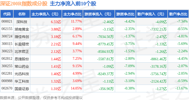 资金流向方面,深证200R(399679)指数成份股当日主力资金净流出合计128.24亿元,游资资金净流入合计23.49亿元,散户资金净流入合计104.75亿元。成份股资金流向详情见下表: