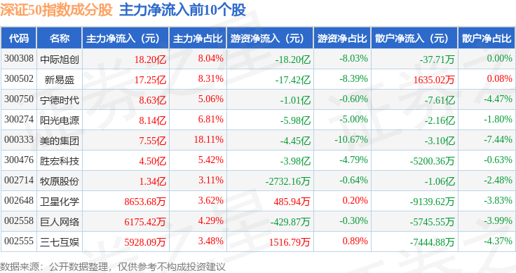 资金流向方面,深证50(399850)指数成份股当日主力资金净流出合计7.49亿元,游资资金净流出合计26.37亿元,散户资金净流入合计33.86亿元。成份股资金流向详情见下表: