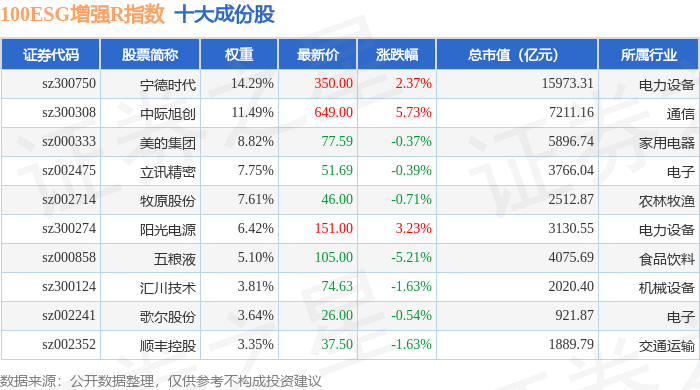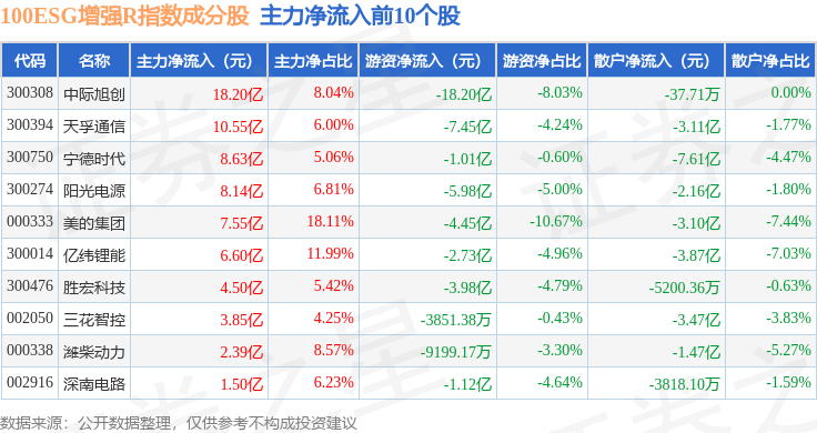 资金流向方面,100ESG增强R(470033)指数成份股当日主力资金净流入合计40.57亿元,游资资金净流出合计36.28亿元,散户资金净流出合计4.29亿元。成份股资金流向详情见下表: