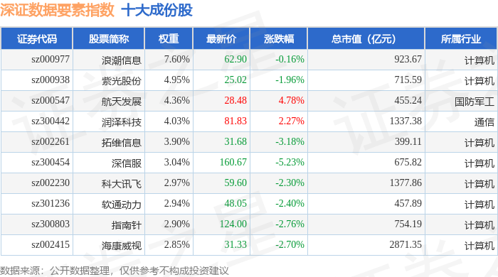 深证数据要素(970053)指数十大成份股详情如下: