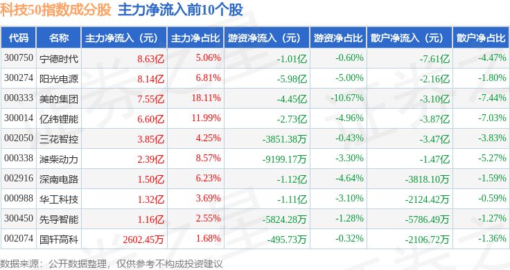 资金流向方面,科技50(970080)指数成份股当日主力资金净流出合计37.35亿元,游资资金净流出合计1.52亿元,散户资金净流入合计38.87亿元。成份股资金流向详情见下表:
