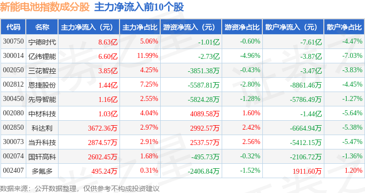 资金流向方面,新能电池(980032)指数成份股当日主力资金净流出合计22.11亿元,游资资金净流入合计7.04亿元,散户资金净流入合计14.89亿元。成份股资金流向详情见下表: