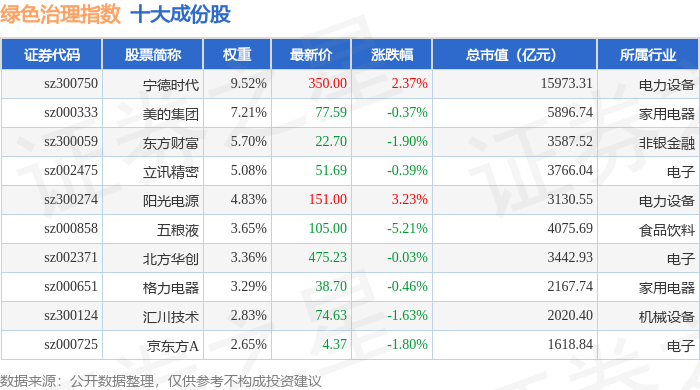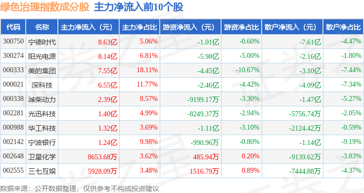 资金流向方面,绿色治理(980058)指数成份股当日主力资金净流出合计48.79亿元,游资资金净流入合计7.43亿元,散户资金净流入合计41.36亿元。成份股资金流向详情见下表: