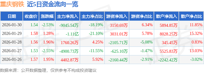 证券之星消息,截至2026年1月30日收盘,重庆钢铁(601005)报收于1.54元,下跌2.53%,换手率3.92%,成交量325.79万手,成交额4.97亿元。