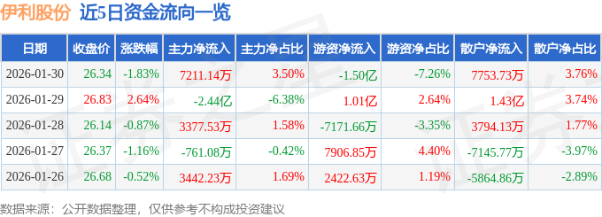 证券之星消息,截至2026年1月30日收盘,伊利股份(600887)报收于26.34元,下跌1.83%,换手率1.24%,成交量77.73万手,成交额20.61亿元。
