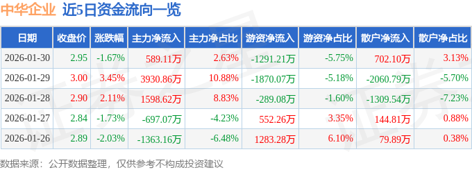 证券之星消息,截至2026年1月30日收盘,中华企业(600675)报收于2.95元,下跌1.67%,换手率1.26%,成交量75.91万手,成交额2.24亿元。