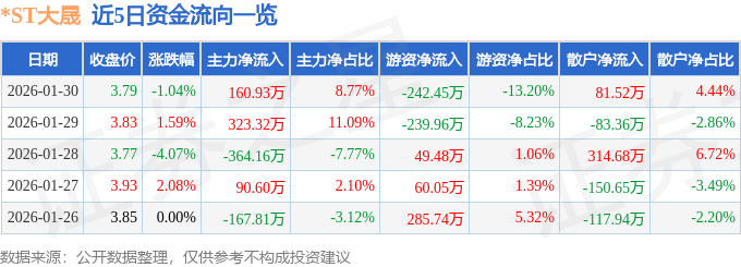 证券之星消息,截至2026年1月30日收盘,*ST大晟(600892)报收于3.79元,下跌1.04%,换手率0.87%,成交量4.86万手,成交额1836.06万元。