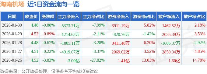 证券之星消息,截至2026年1月30日收盘,海南机场(600515)报收于4.48元,下跌0.88%,换手率1.62%,成交量148.39万手,成交额6.72亿元。