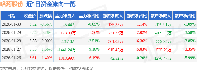 证券之星消息,截至2026年1月30日收盘,哈药股份(600664)报收于3.52元,下跌0.56%,换手率1.34%,成交量33.71万手,成交额1.19亿元。