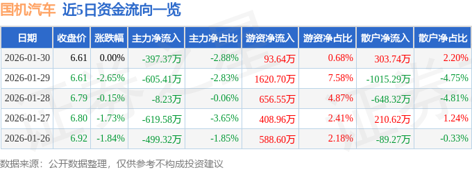 证券之星消息,截至2026年1月30日收盘,国机汽车(600335)报收于6.61元,上涨0.0%,换手率1.4%,成交量20.96万手,成交额1.38亿元。