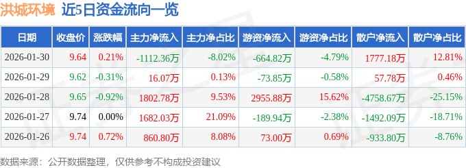 证券之星消息,截至2026年1月30日收盘,洪城环境(600461)报收于9.64元,上涨0.21%,换手率1.11%,成交量14.31万手,成交额1.39亿元。