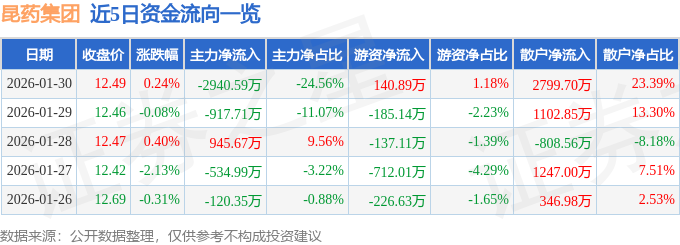 证券之星消息,截至2026年1月30日收盘,昆药集团(600422)报收于12.49元,上涨0.24%,换手率1.26%,成交量9.56万手,成交额1.2亿元。