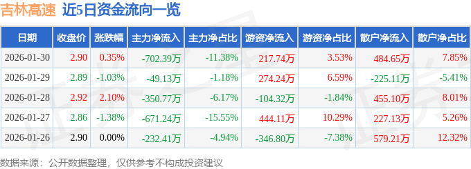证券之星消息,截至2026年1月30日收盘,吉林高速(601518)报收于2.9元,上涨0.35%,换手率1.12%,成交量21.25万手,成交额6173.45万元。