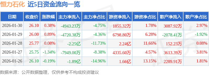证券之星消息,截至2026年1月30日收盘,恒力石化(600346)报收于26.1元,上涨0.38%,换手率0.57%,成交量40.01万手,成交额10.4亿元。