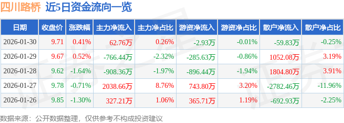 证券之星消息,截至2026年1月30日收盘,四川路桥(600039)报收于9.71元,上涨0.41%,换手率0.29%,成交量24.92万手,成交额2.44亿元。