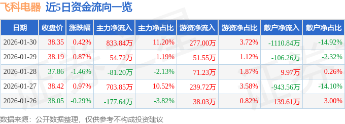 证券之星消息,截至2026年1月30日收盘,飞科电器(603868)报收于38.35元,上涨0.42%,换手率0.45%,成交量1.94万手,成交额7444.78万元。