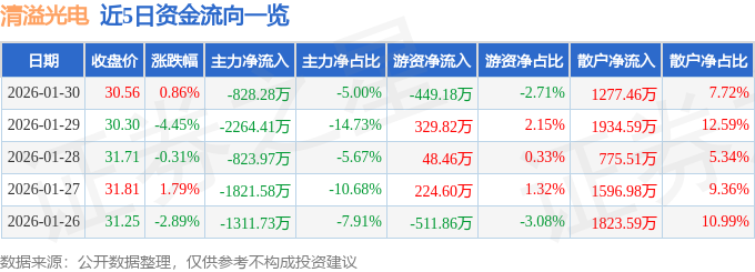 证券之星消息,截至2026年1月30日收盘,清溢光电(688138)报收于30.56元,上涨0.86%,换手率1.75%,成交量5.51万手,成交额1.66亿元。
