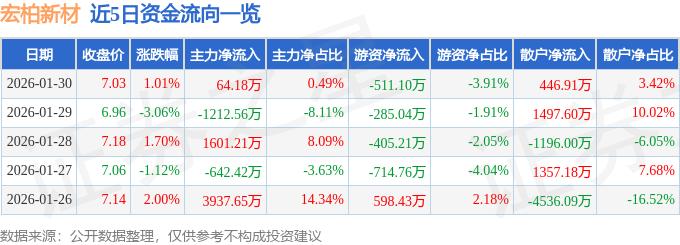 证券之星消息,截至2026年1月30日收盘,宏柏新材(605366)报收于7.03元,上涨1.01%,换手率2.88%,成交量18.72万手,成交额1.31亿元。
