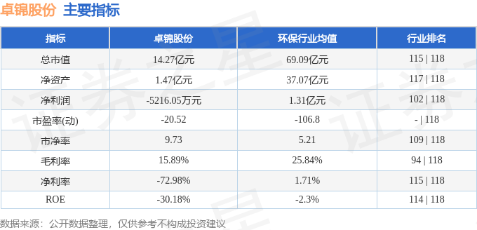 卓锦股份2025年三季报显示,前三季度公司主营收入7160.17万元,同比下降61.57%;归母净利润-5216.05万元,同比下降23.0%;扣非净利润-4940.23万元,同比下降15.58%;其中2025年第三季度,公司单季度主营收入3024.85万元,同比下降55.73%;单季度归母净利润-3324.21万元,同比下降76.46%;单季度扣非净利润-3002.14万元,同比下降61.19%;负债率69.65%,投资收益-441.76万元,财务费用589.28万元,毛利率15.89%。卓锦股份(688701)主营业务:覆盖“环保综合治理服务”、“环保产品销售与服务”两类,其中环保综合治理服务主要包括土壤及地下水修复、水污染治理、水体修复、废气处理、固废处理与处置等五大业务条线,环保产品销售与服务主要向下游客户提供产品销售及维护服务。