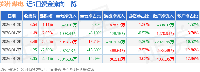 证券之星消息,截至2026年1月30日收盘,郑州煤电(600121)报收于4.54元,上涨1.11%,换手率9.42%,成交量114.76万手,成交额5.31亿元。