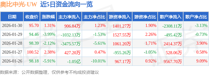 证券之星消息,截至2026年1月30日收盘,奥比中光(688322)报收于95.7元,上涨1.31%,换手率2.44%,成交量7.78万手,成交额7.37亿元。
