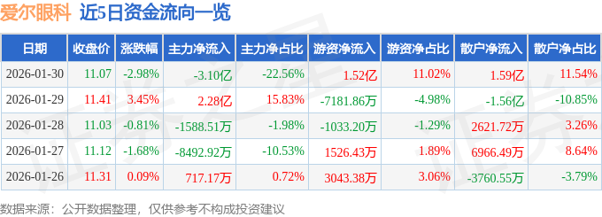 证券之星消息,截至2026年1月30日收盘,爱尔眼科(300015)报收于11.07元,下跌2.98%,换手率1.55%,成交量123.09万手,成交额13.76亿元。