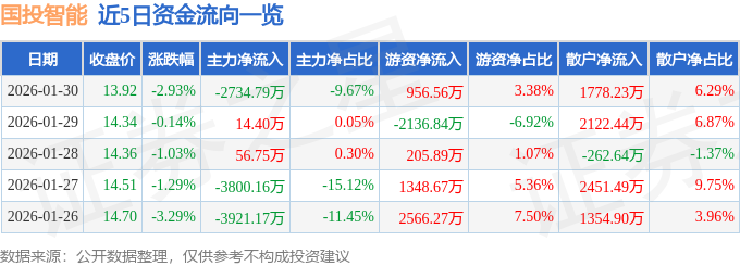 证券之星消息,截至2026年1月30日收盘,国投智能(300188)报收于13.92元,下跌2.93%,换手率2.36%,成交量20.15万手,成交额2.83亿元。