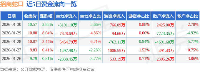 证券之星消息,截至2026年1月30日收盘,招商蛇口(001979)报收于10.57元,下跌2.85%,换手率0.98%,成交量82.4万手,成交额8.72亿元。