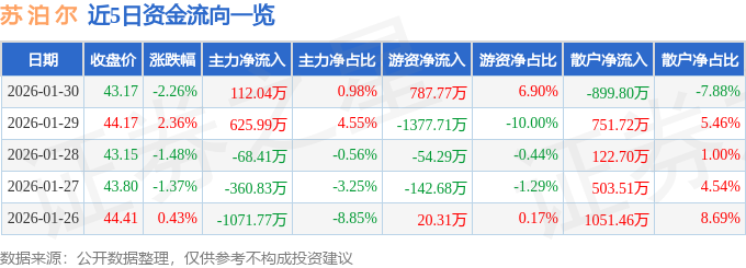 证券之星消息,截至2026年1月30日收盘,苏 泊 尔(002032)报收于43.17元,下跌2.26%,换手率0.32%,成交量2.6万手,成交额1.14亿元。