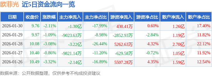 证券之星消息,截至2026年1月30日收盘,欧菲光(002456)报收于9.76元,下跌2.11%,换手率2.22%,成交量73.5万手,成交额7.22亿元。