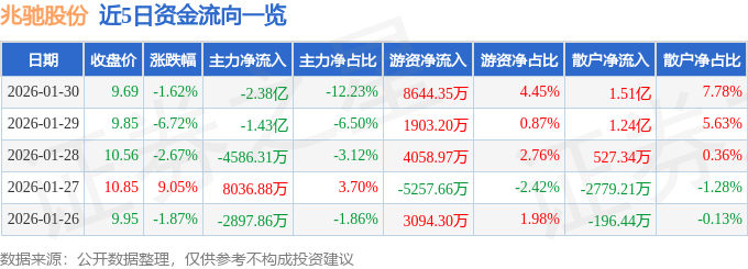 证券之星消息,截至2026年1月30日收盘,兆驰股份(002429)报收于9.69元,下跌1.62%,换手率4.46%,成交量201.82万手,成交额19.41亿元。