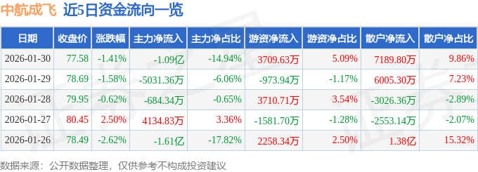 证券之星消息,截至2026年1月30日收盘,中航成飞(302132)报收于77.58元,下跌1.41%,换手率1.61%,成交量9.41万手,成交额7.3亿元。