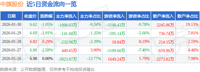 证券之星消息,截至2026年1月30日收盘,中旗股份(300575)报收于6.62元,下跌1.05%,换手率5.22%,成交量17.88万手,成交额1.17亿元。