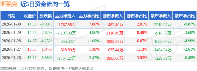 证券之星消息,截至2026年1月30日收盘,斯莱克(300382)报收于14.35元,下跌0.9%,换手率2.43%,成交量15.75万手,成交额2.25亿元。