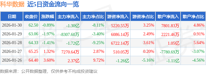 证券之星消息,截至2026年1月30日收盘,科华数据(002335)报收于62.5元,下跌0.89%,换手率5.69%,成交量25.89万手,成交额16.06亿元。