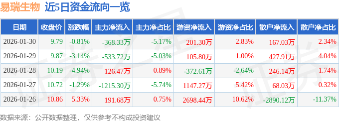 证券之星消息,截至2026年1月30日收盘,易瑞生物(300942)报收于9.79元,下跌0.81%,换手率1.79%,成交量7.26万手,成交额7124.5万元。