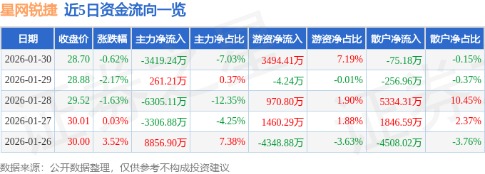 证券之星消息,截至2026年1月30日收盘,星网锐捷(002396)报收于28.7元,下跌0.62%,换手率2.89%,成交量16.87万手,成交额4.86亿元。