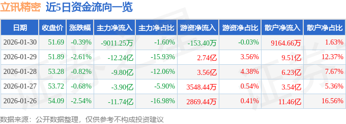 证券之星消息,截至2026年1月30日收盘,立讯精密(002475)报收于51.69元,下跌0.39%,换手率1.49%,成交量108.56万手,成交额56.32亿元。