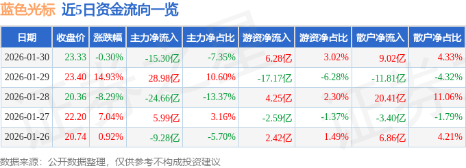 1月30日的资金流向数据方面,主力资金净流出15.3亿元,占总成交额7.35%,游资资金净流入6.28亿元,占总成交额3.02%,散户资金净流入9.02亿元,占总成交额4.33%。