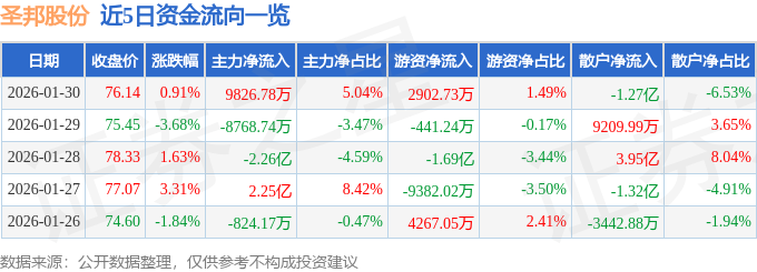 证券之星消息,截至2026年1月30日收盘,圣邦股份(300661)报收于76.14元,上涨0.91%,换手率4.37%,成交量25.91万手,成交额19.5亿元。