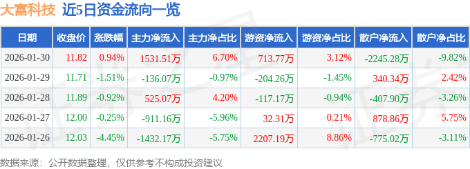 证券之星消息,截至2026年1月30日收盘,大富科技(300134)报收于11.82元,上涨0.94%,换手率2.74%,成交量19.56万手,成交额2.29亿元。