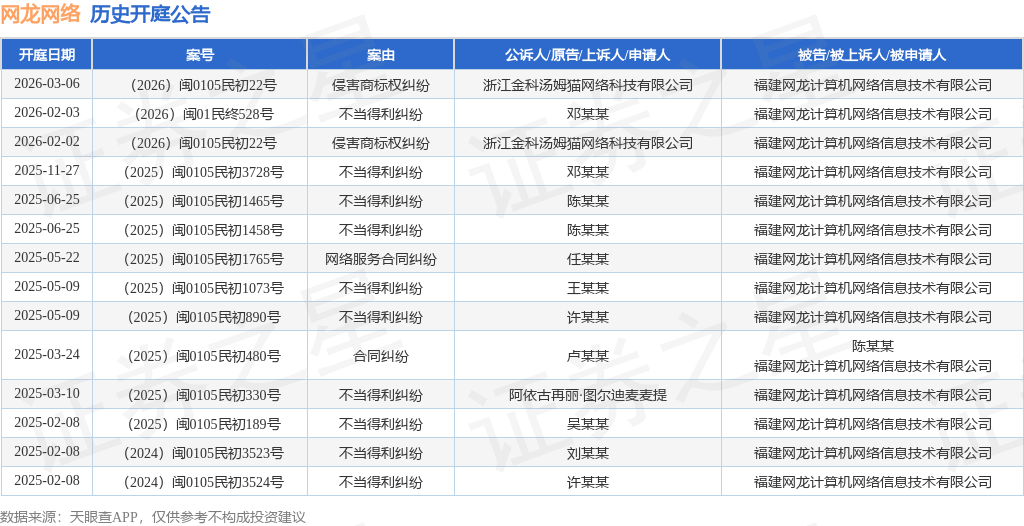 案号:(2026)闽0105民初22号根据统计,近一年内以福建网龙计算机网络信息技术有限公司为当事人的历史开庭公告有14则,其中案由为“不当得利纠纷”的公告以10则居首,其次为“侵害商标权纠纷”有2则,“合同纠纷”有1则。历史开庭公告如下: